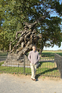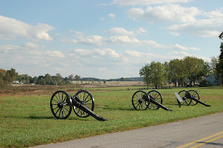 Resumen en español: Acabamos de ver el debate entre los candidatos para la vice-presidencia y mientras que los analistas hacen su trabajo, escribo un poco sobre el dia de hoy. Antes de ir al centro de visitas de Gettysburg, pueblo conocido por la batalla entre los Unionistas (del norte) y los Confederales (del sur), fuimos a un taller donde repararon el sistema electrico de 12V (sin coste dado que el coche aun ha pasado el plazo de la garantia). El centro es completamente nuevo y muestra muy bien mediante pelicula, ciclorama y museo todo sobre la guerra civil y la famosa batalla de tres dias en julio 1863. El origen de la guerra civil fue la cesión del sur de la unión de estados, porque el nuevo presidente Lincoln, elegido en 1860, queria liberar a los eslavos del sur, como ya ha pasado en el norte. Economicamente dependió el sur directamente de ese sistema, agricultara (coton), y el norte indirectamente (industria de textil), pero la constitución dice que todos los ciudanos son iguales. Después de la visita al centro tomamos el coche para circular la ruta de unos 24 millas (40 km) como un museo drive-in (auto-tour dicen aqui). Muy practico como casi todo aqui, y con un CD con comentarios que compramos en la tienda del centro. La ruta pasa por las lineas de estos tres días donde hay muchos monumentos y cañones. La puesta del sol es alrededor de las 6pm, por lo cual no terminamos la ruta, y por eso haremos el resto mañana antes de ir a Washington DC.