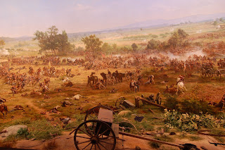 Daarna zijn we naar het Gettysburg visitors centrum gereden. Dit dorpje is vooral bekend om de drie-daagse slag tussen de Unionisten (het noorden) en de Confederalen (het zuiden) in 1863, die een omslagpunt was in de burgeroorlog. Het centrum geeft middels een film, een panorama en museum een zeer goede uitleg van de oorzaken die leidden tot de burgeroorlog en alle details van deze slag. Belangrijkste oorzaak: de vraag of de nieuwe, nog op te richten, staten in het westen zogenaamde vrije staten worden of slavenstaten. Het noorden had namelijk al slavernij afgeschaft en het zuiden had slavernij nodig voor haar economisch model gebaseerd op landbouw, m.n. katoen (waar men in het noorden textiel van maakte, en dus eigenlijk indirect slavernij accepteerde).